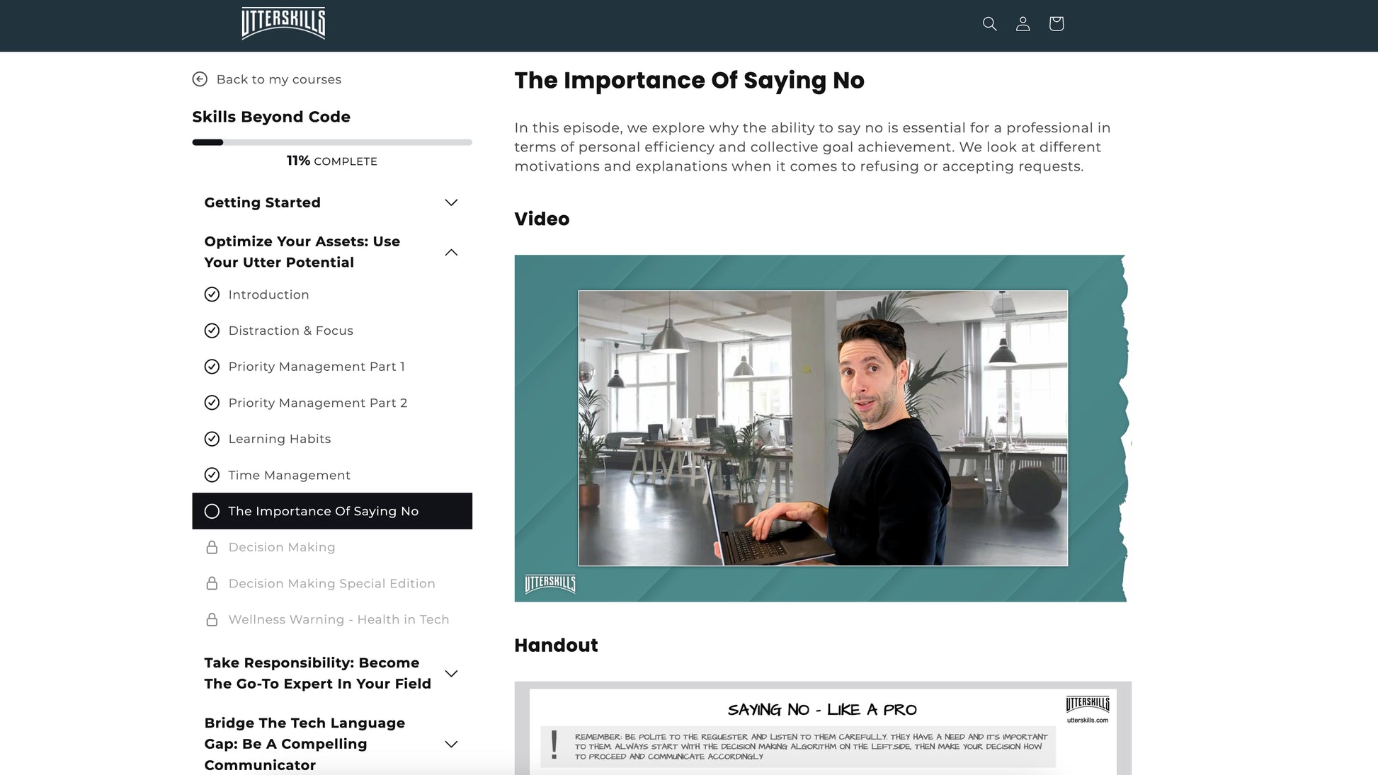 We designed it for immediate impact. Each lesson is just 15 minutes, delivered in a microlearning format that fits easily into the workday - one per day, or more if they choose. Every lesson is based on real situations from the daily job-life in tech, not theory, and comes with a practical handout as a daily-use cheat sheet. The takeaways are instantly applicable, so your developers can start improving how they work from day one.